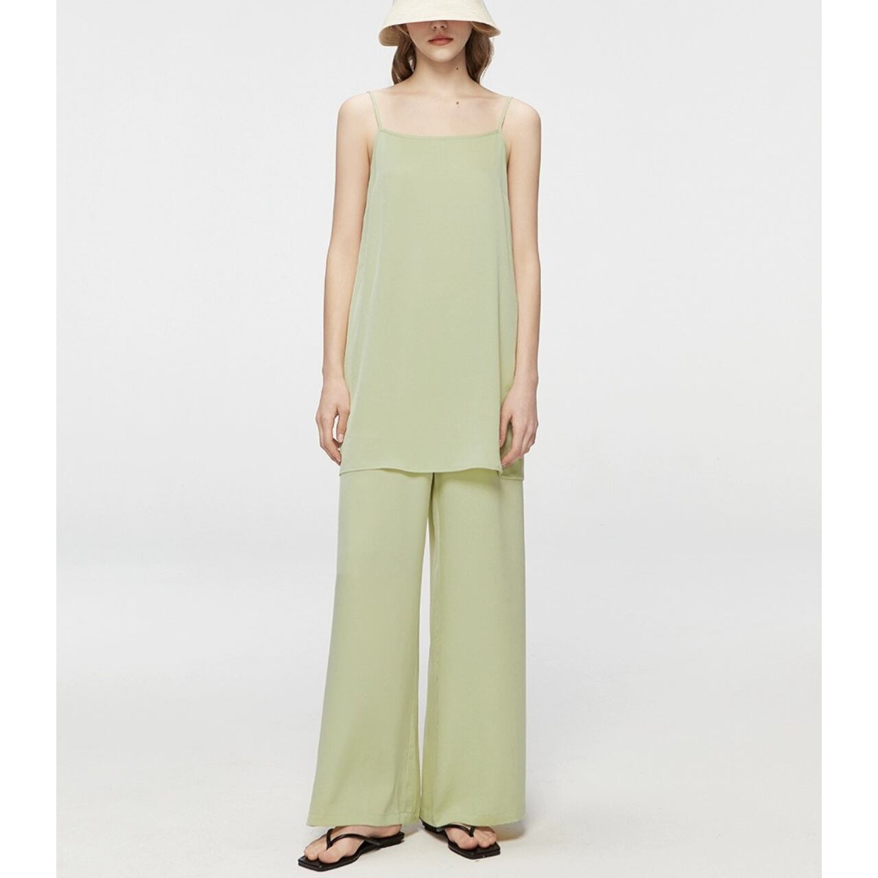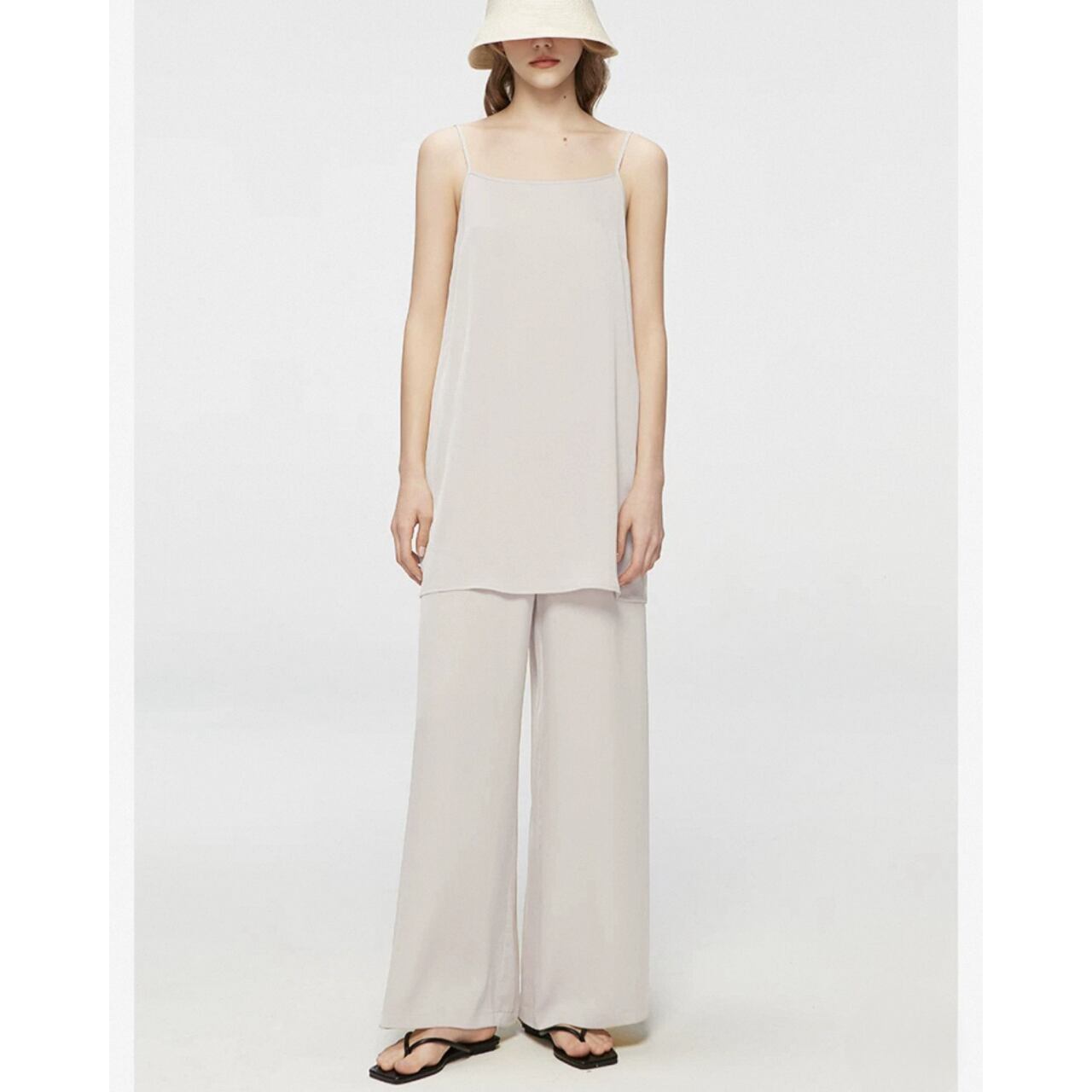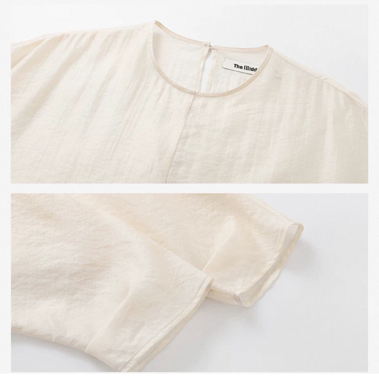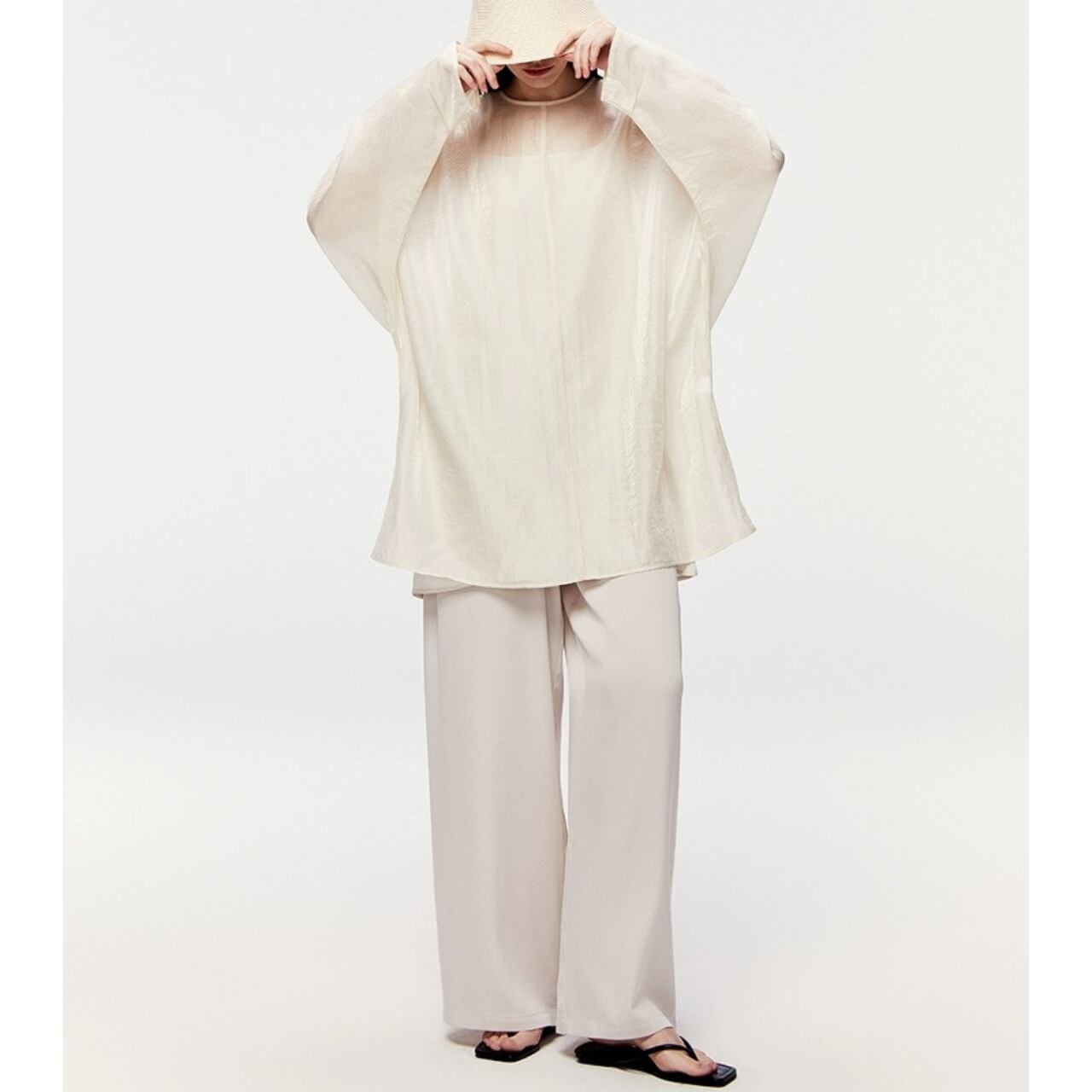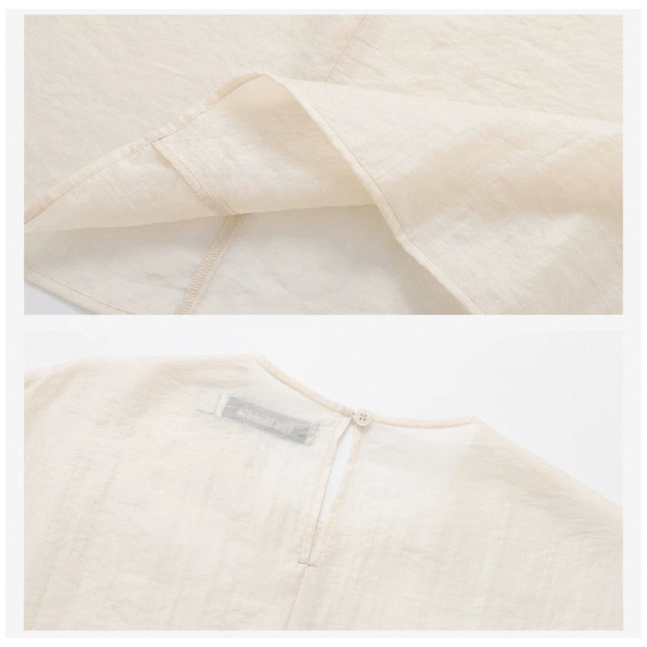 シアーな美しさを重ねる、2ピースのレイヤードトップ。ブラウスは、高密度の抑揚織りがマットな光沢と立体感を生み、どこまでも上品に透ける設計。肌離れの良いドレープの効いたキャミソールと重ねることで、奥行きと静けさが漂う。ヒップまで隠れるゆったりとしたフォルムは、体のラインを拾わず空気をはらんで美しい揺れを生む。纏うだけで美しいモードが漂う、特別な一枚。