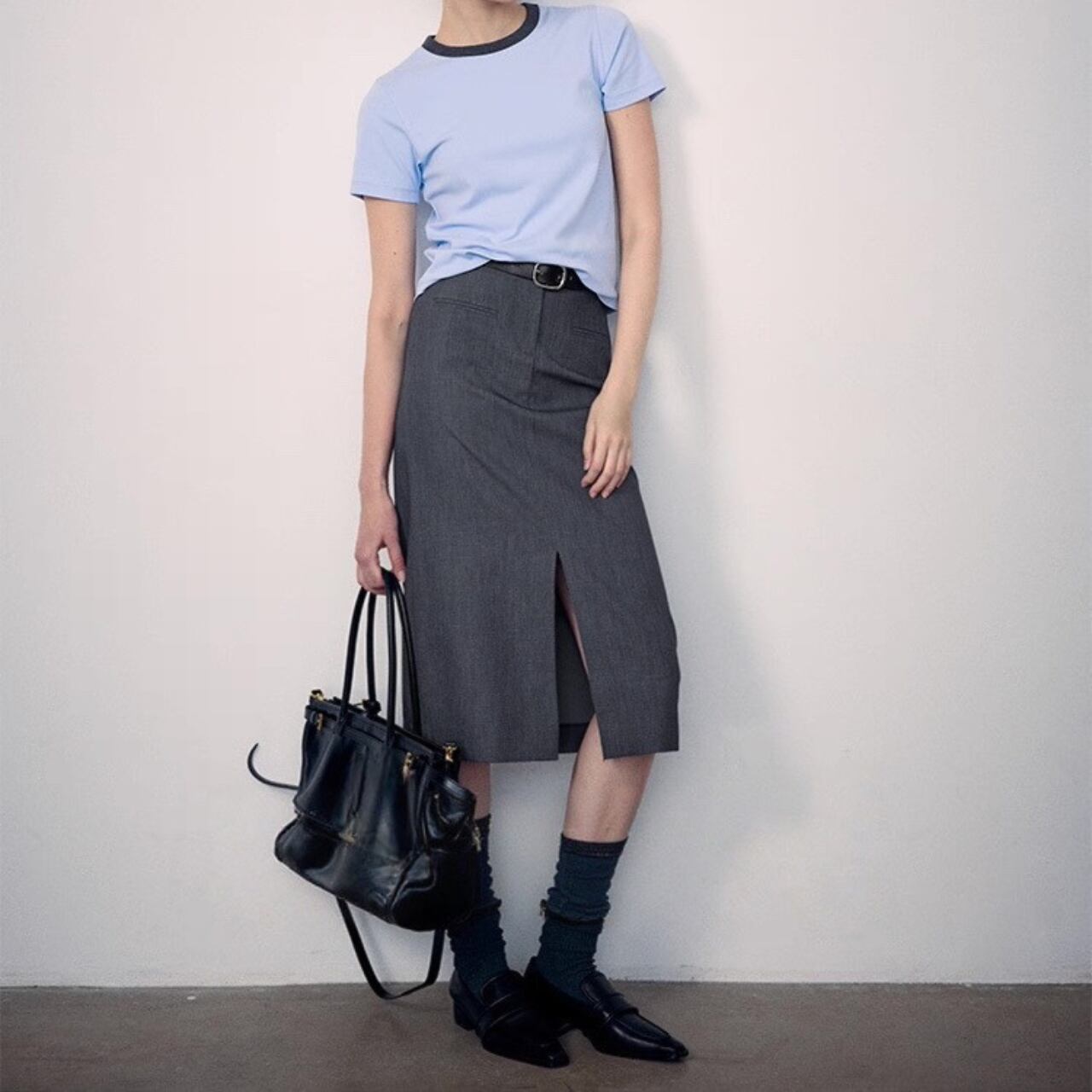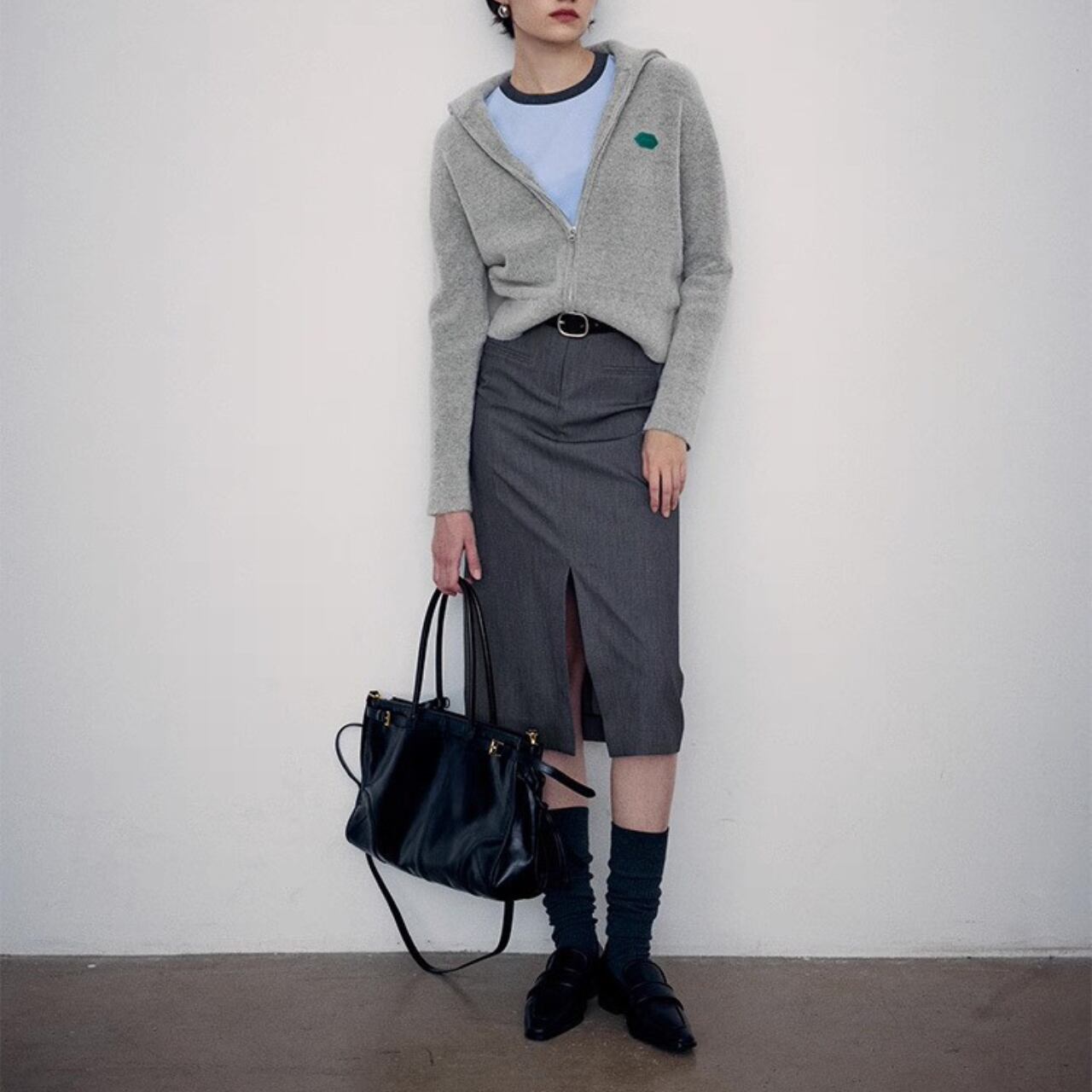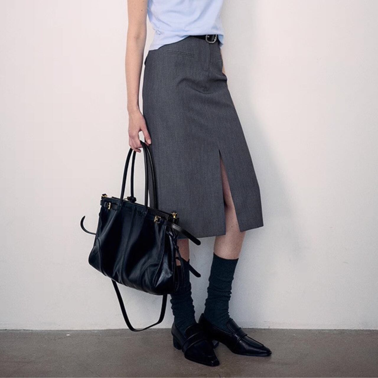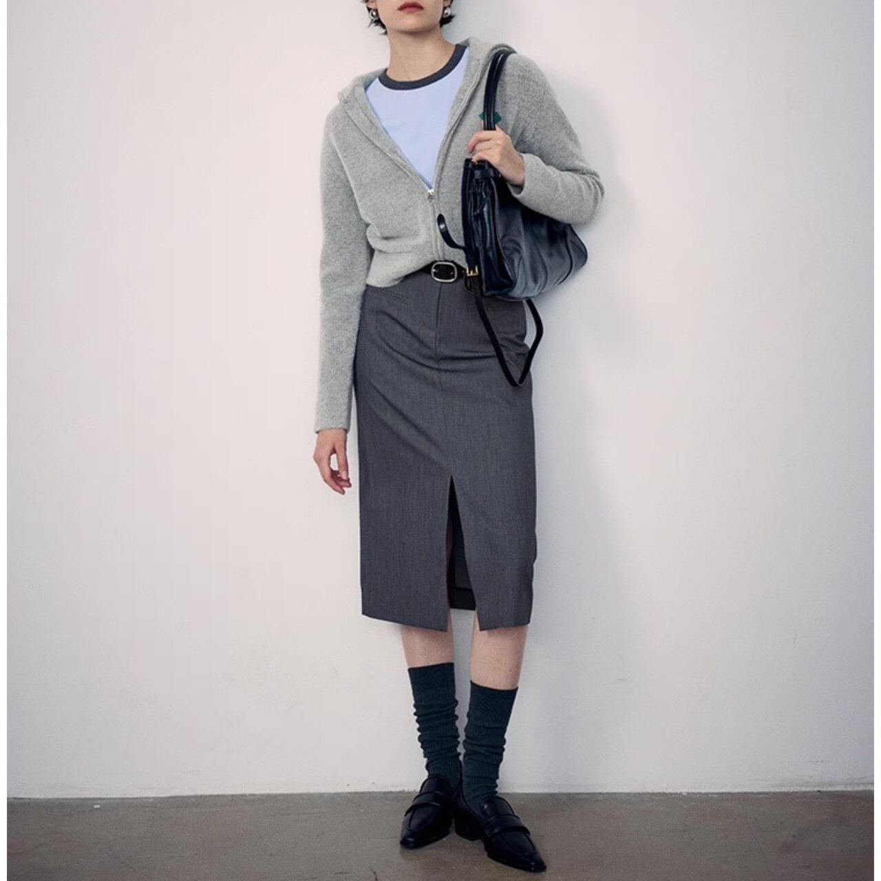 上質感漂うハイエンドなウールブレンド素材を使用。さらりとした肌触りとしっとりとした温もりをあわせ持ち、美しいラインを長くキープできるのも魅力。程よくゆったりとしたHシルエットは自由度とこなれ感を生み、センタースリットと膝下丈がクールで知的な女性らしさを演出する。トップスを選ばず着こなし次第でシーズンを越えて活躍する一着。