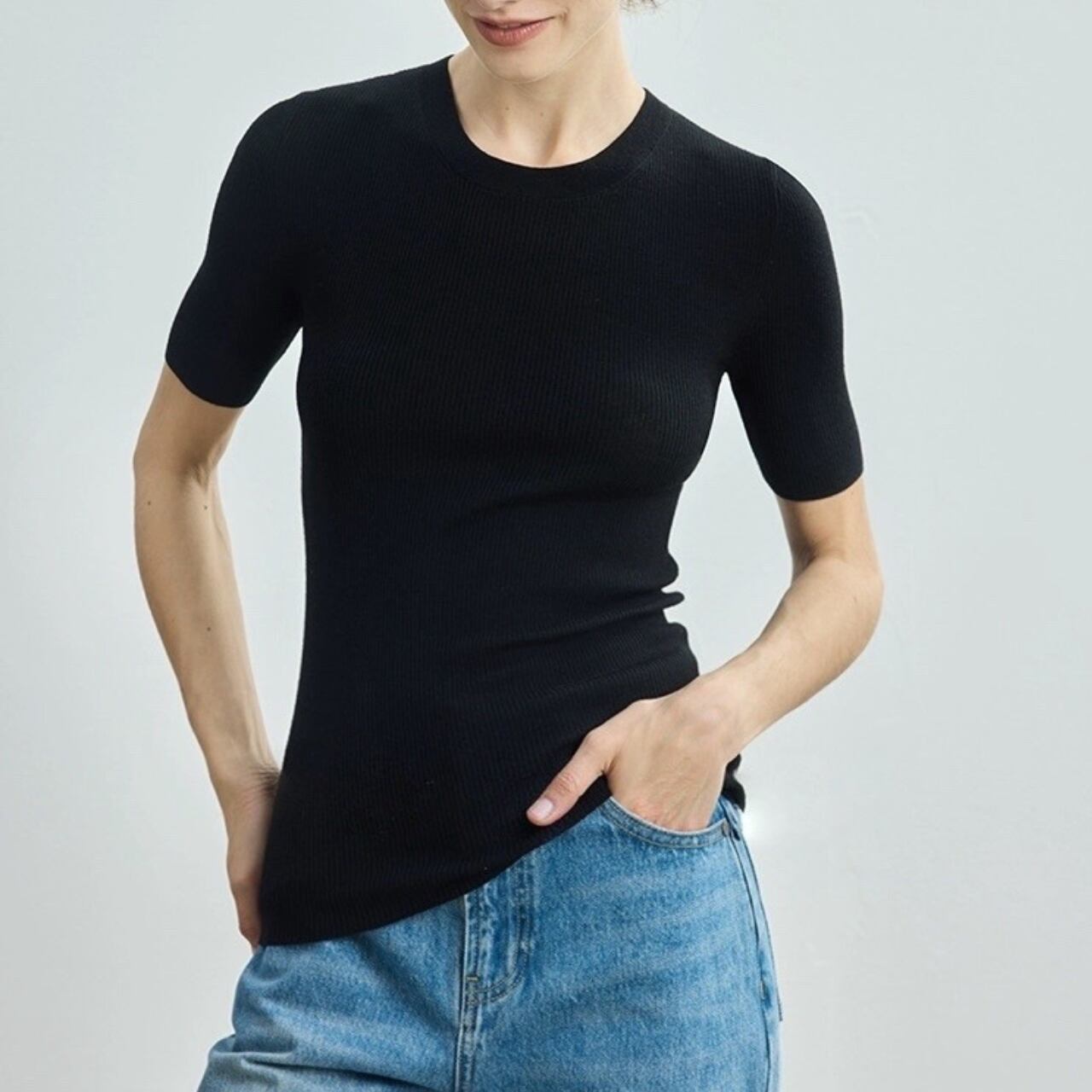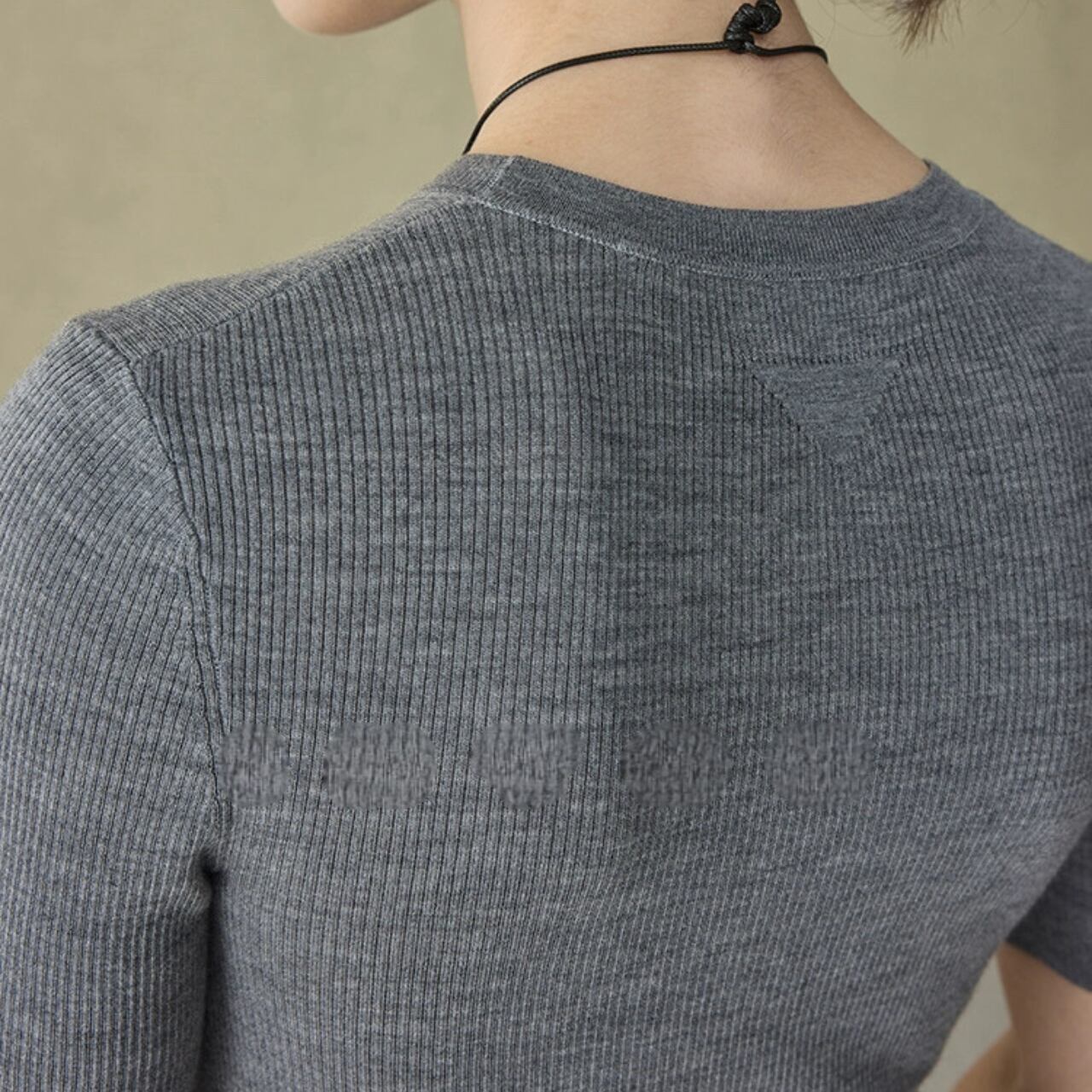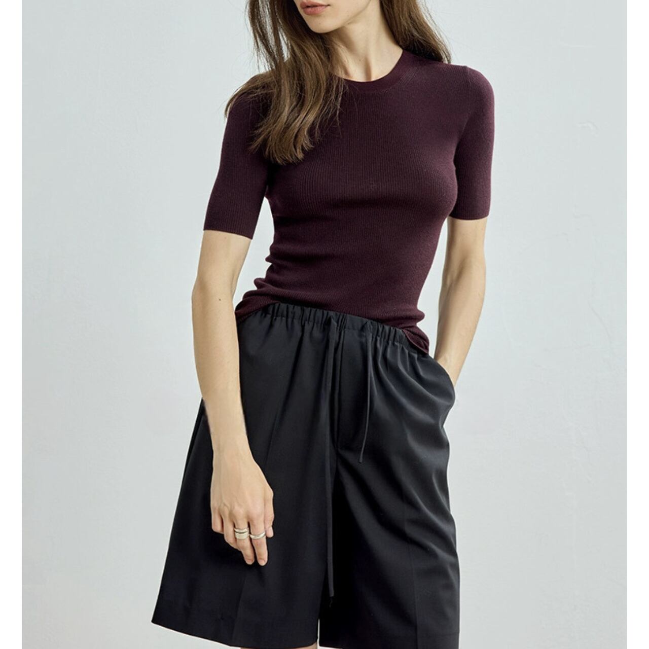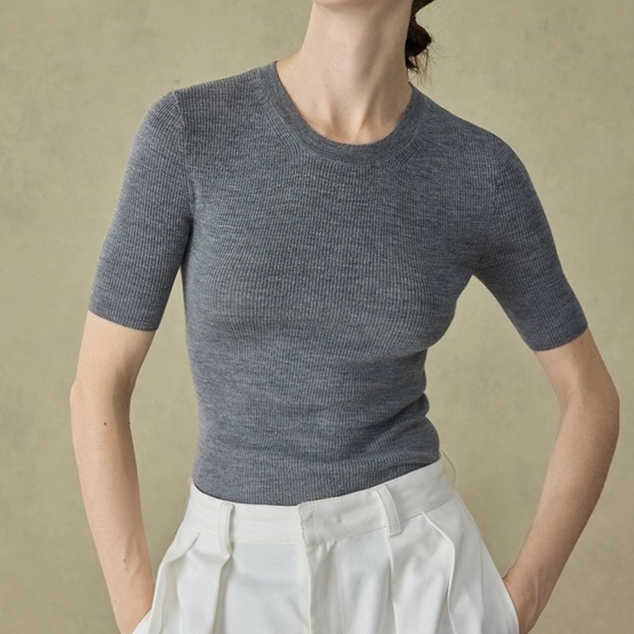 メリノウールのしなやかな肌触りと、うっすら光をまとったような質感。ミニマルなクルーネック、ミドル丈スリーブ、立体的なリブフィットライン、全て計算されたディテールが、身体のラインを美しくエレガントに魅せる。日常に寄り添う、洗練ニット。