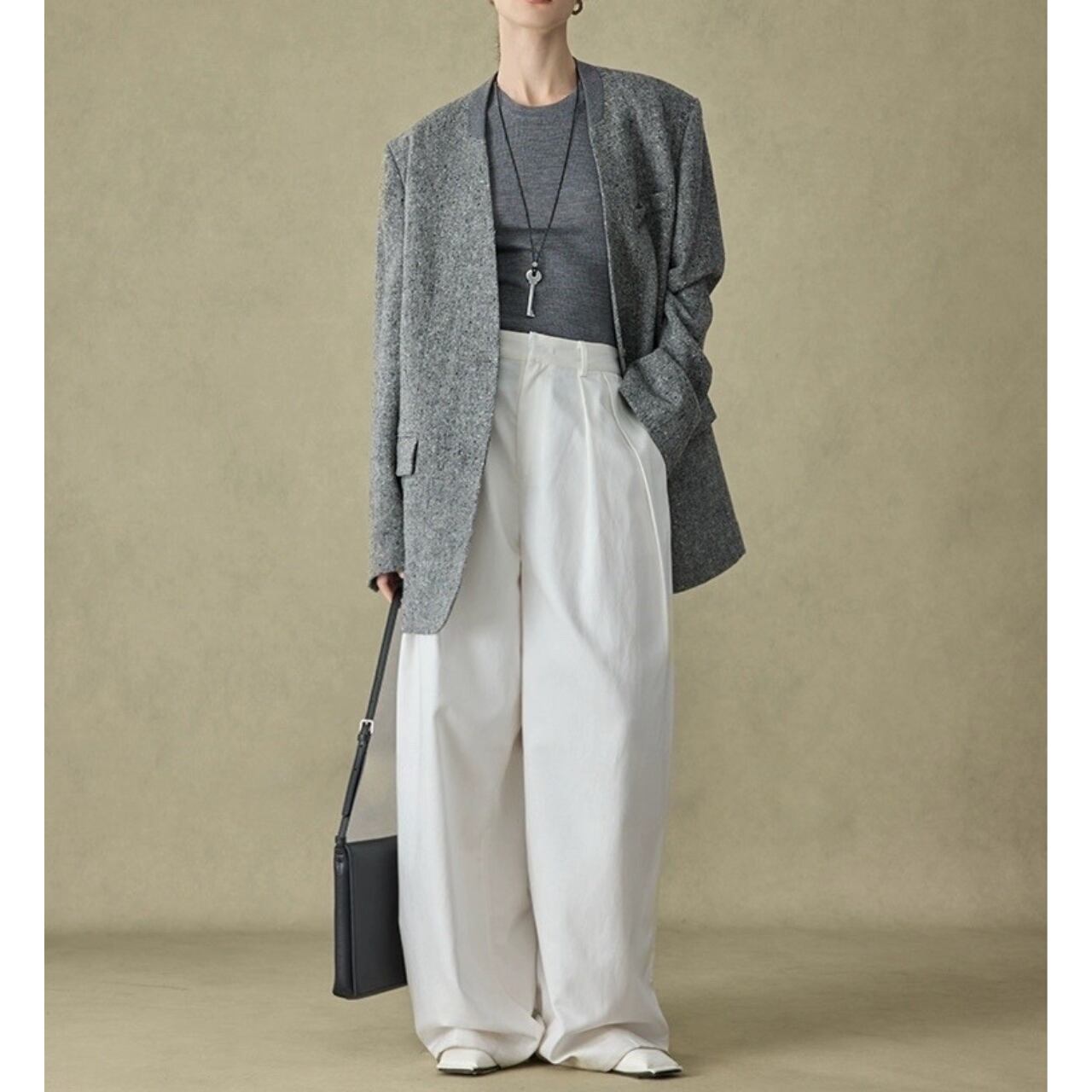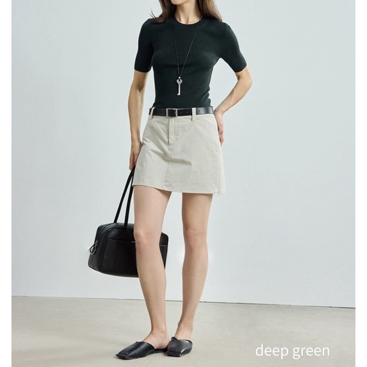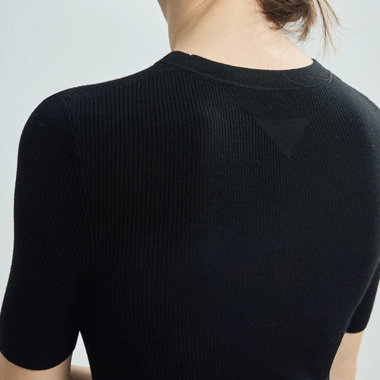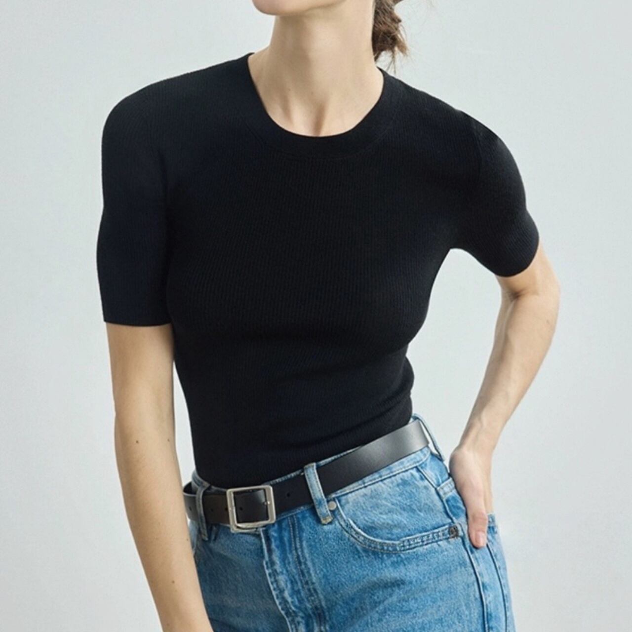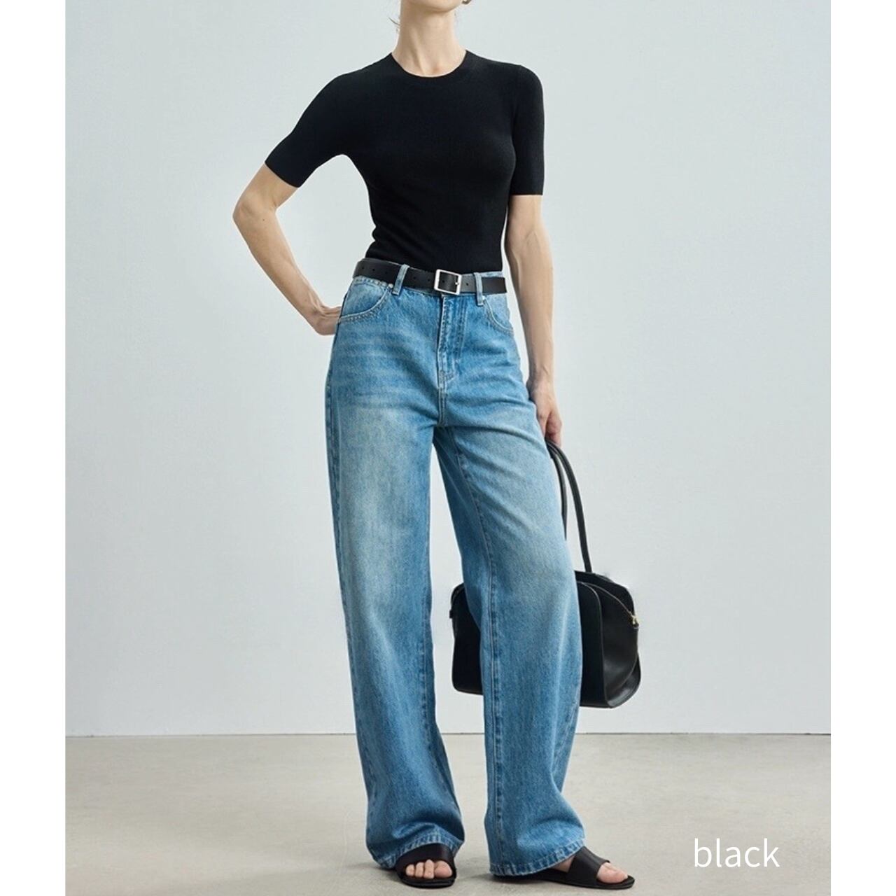 メリノウールのしなやかな肌触りと、うっすら光をまとったような質感。ミニマルなクルーネック、ミドル丈スリーブ、立体的なリブフィットライン、全て計算されたディテールが、身体のラインを美しくエレガントに魅せる。日常に寄り添う、洗練ニット。