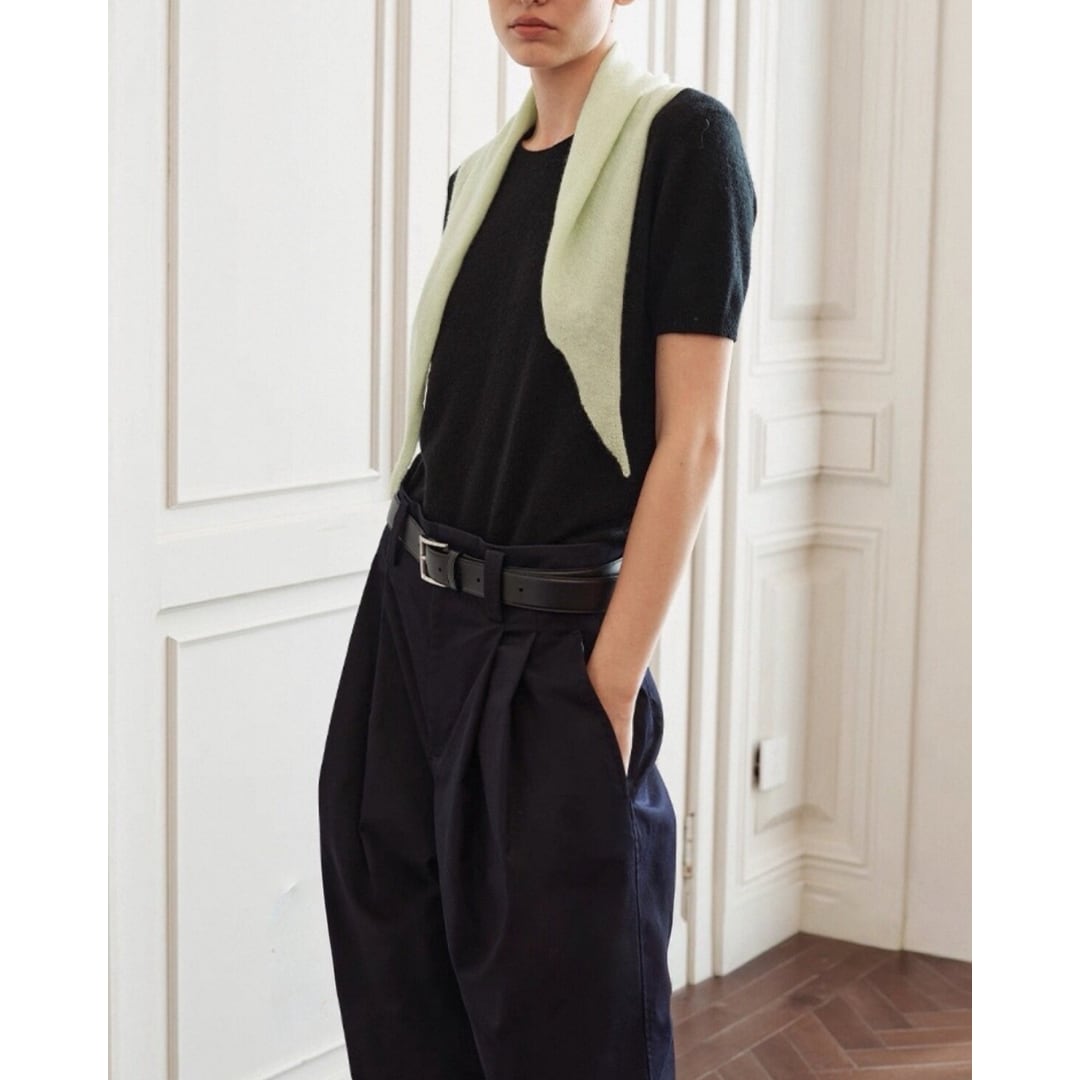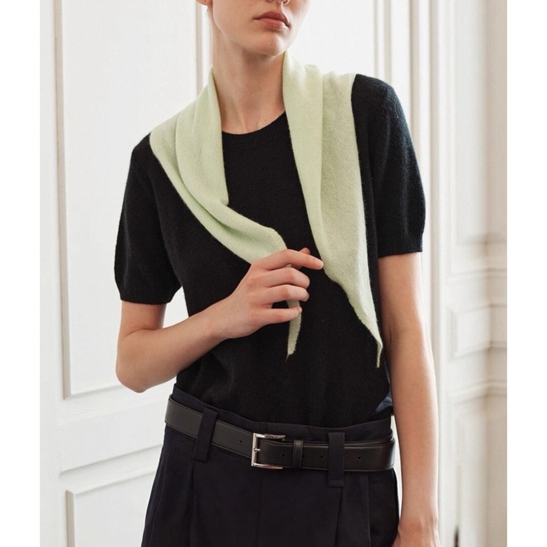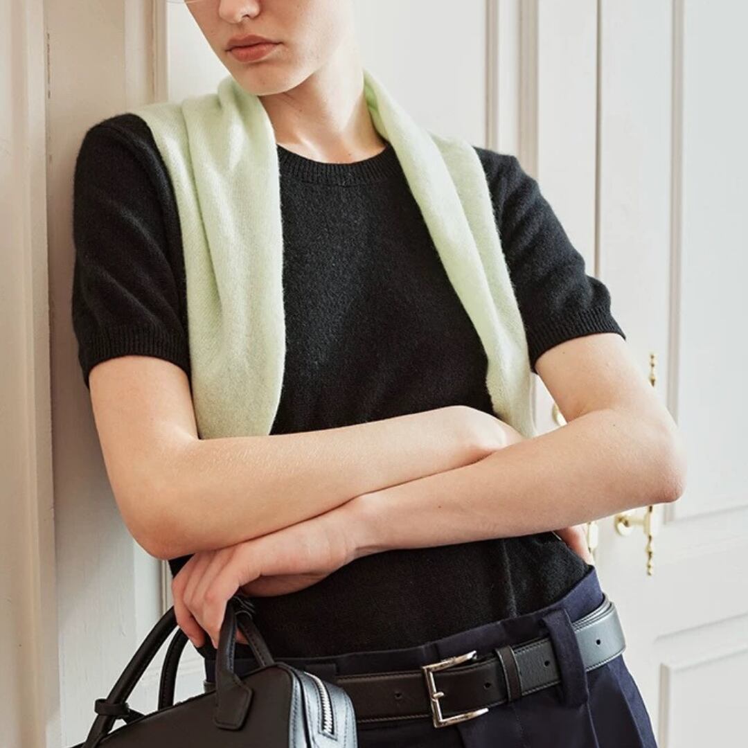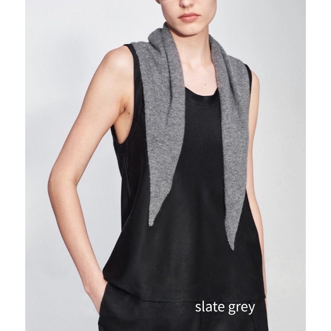 贅沢にカシミア糸を使用したトライアングルストール。軽やかなのに暖かく、素肌に溶け込むような柔らかさ。肩に掛けても首に巻いても、スタイルに奥行きを与え、洗練された存在感と抜け感を絶妙に両立させる。纏うだけでいつもの装いを格上げする、季節の変わり目に気が利く逸品。