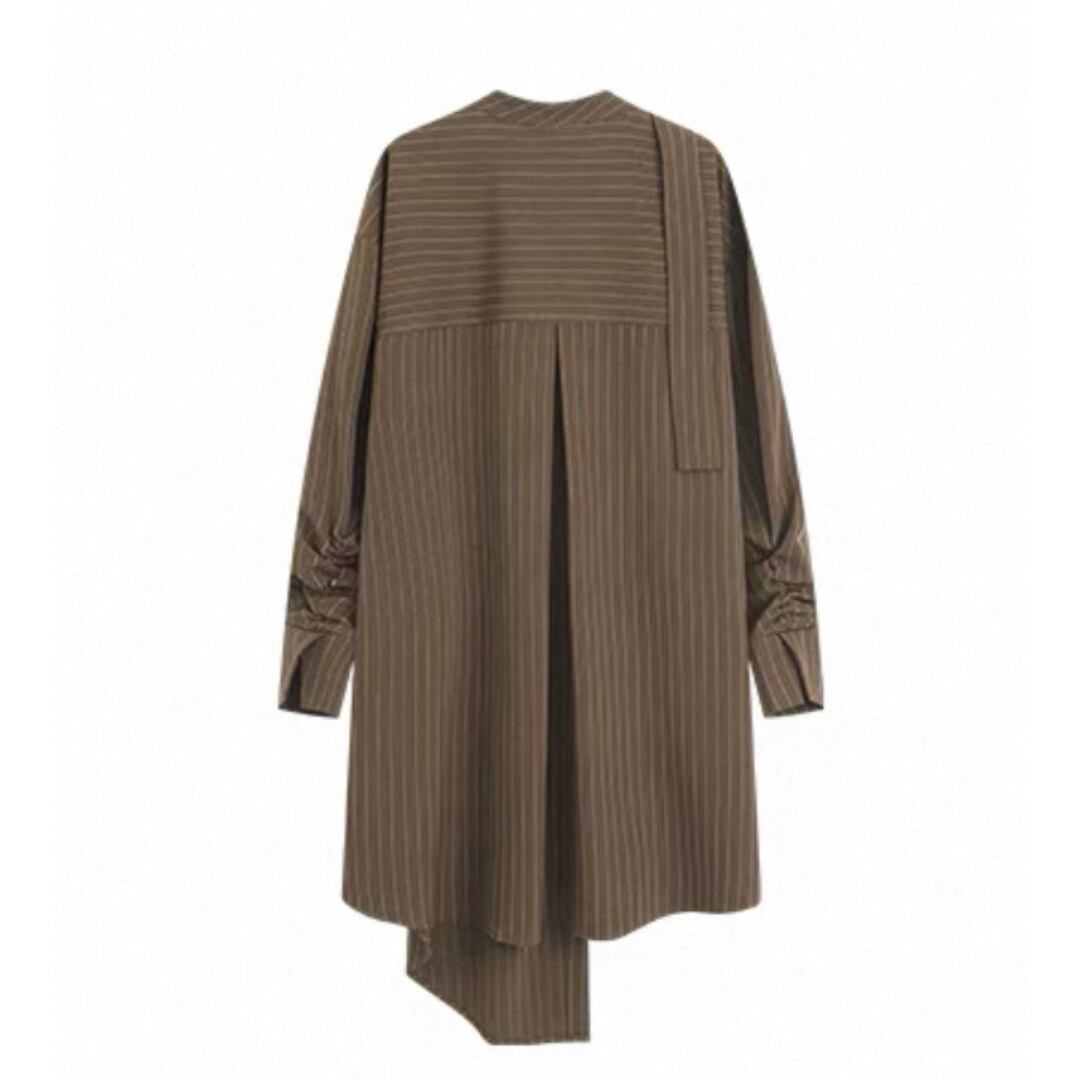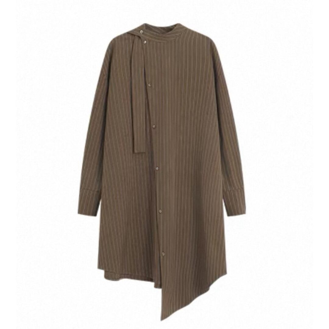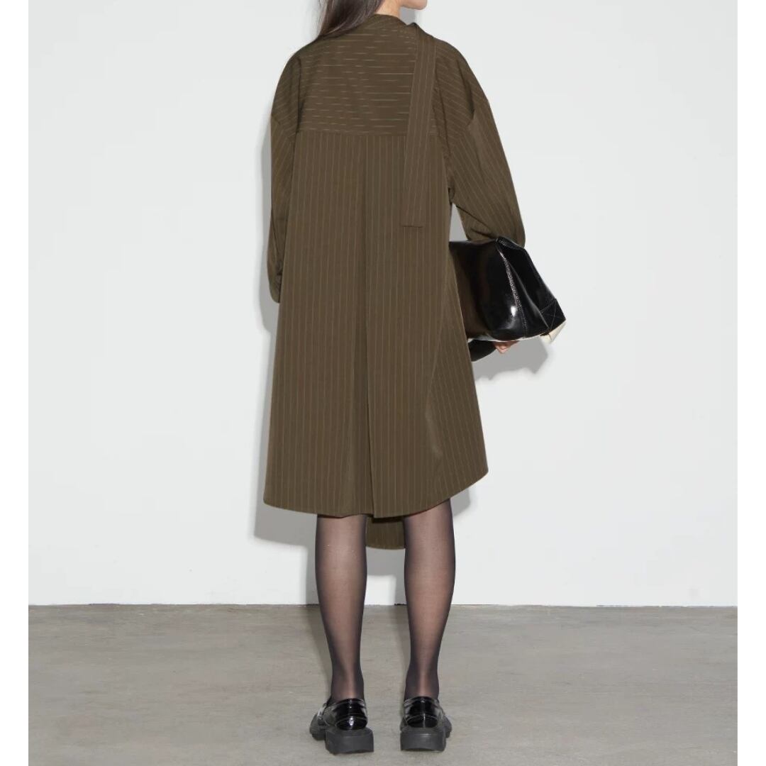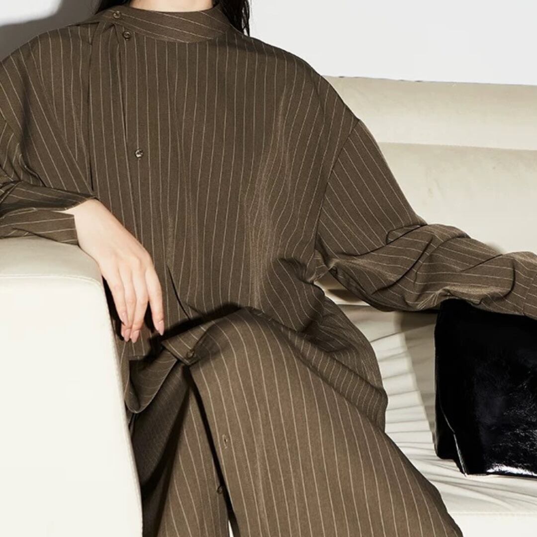 落ち感のあるストライプが描く、直線的で凛としたシルエット。生地は防シワ性に優れ、ハリがありながらも柔らかく自然なドレープを生む。襟のリボンは垂らしてモードに、サイドで結んで柔らかくニュアンスを添えて。一枚でも、ワイドパンツと重ねても、自在に楽しめる一枚。