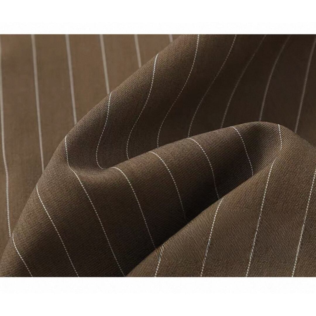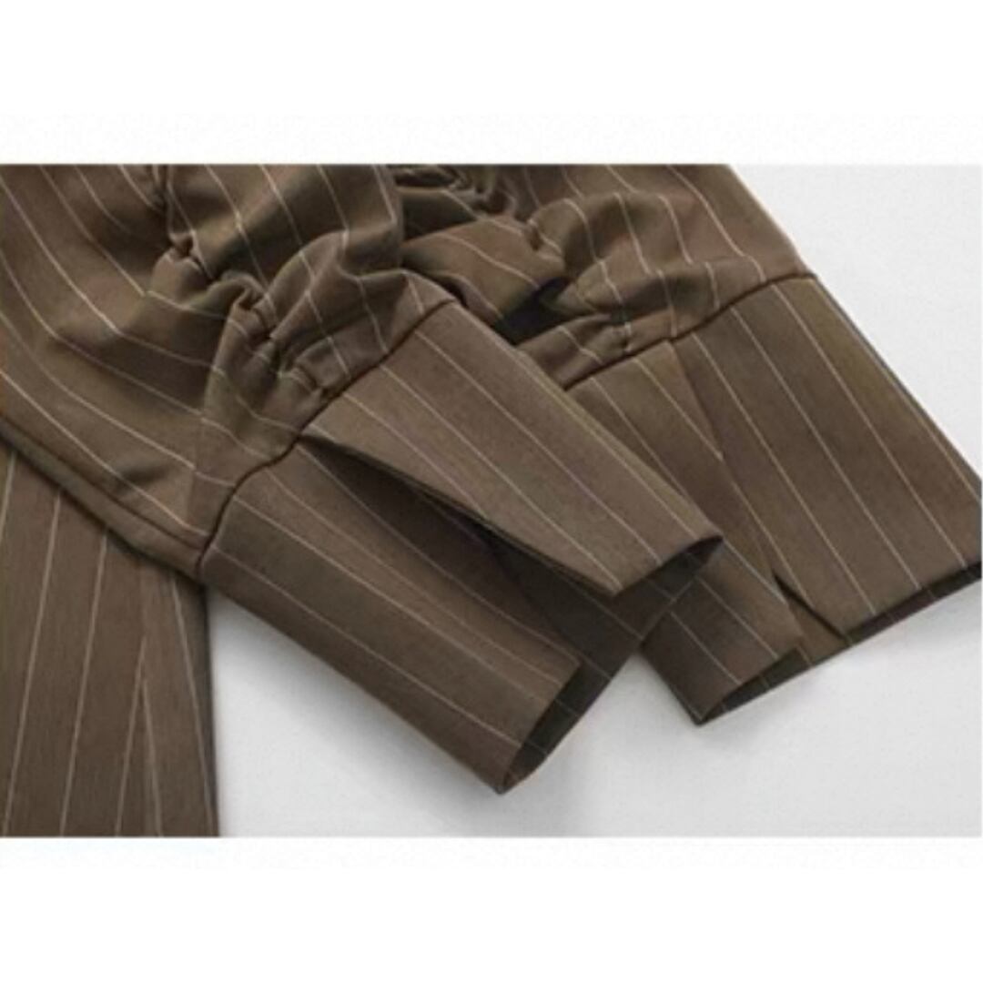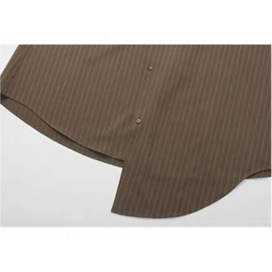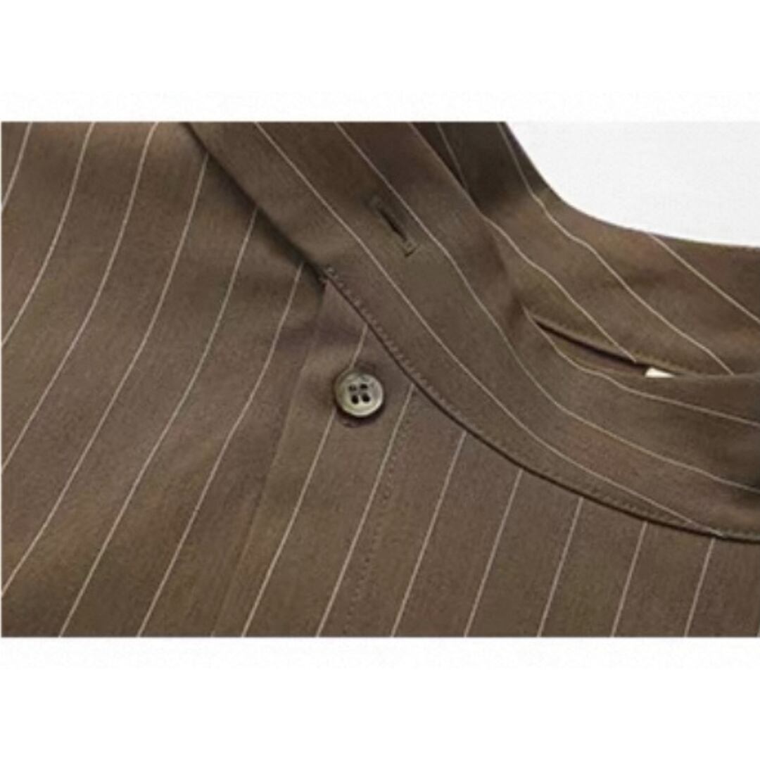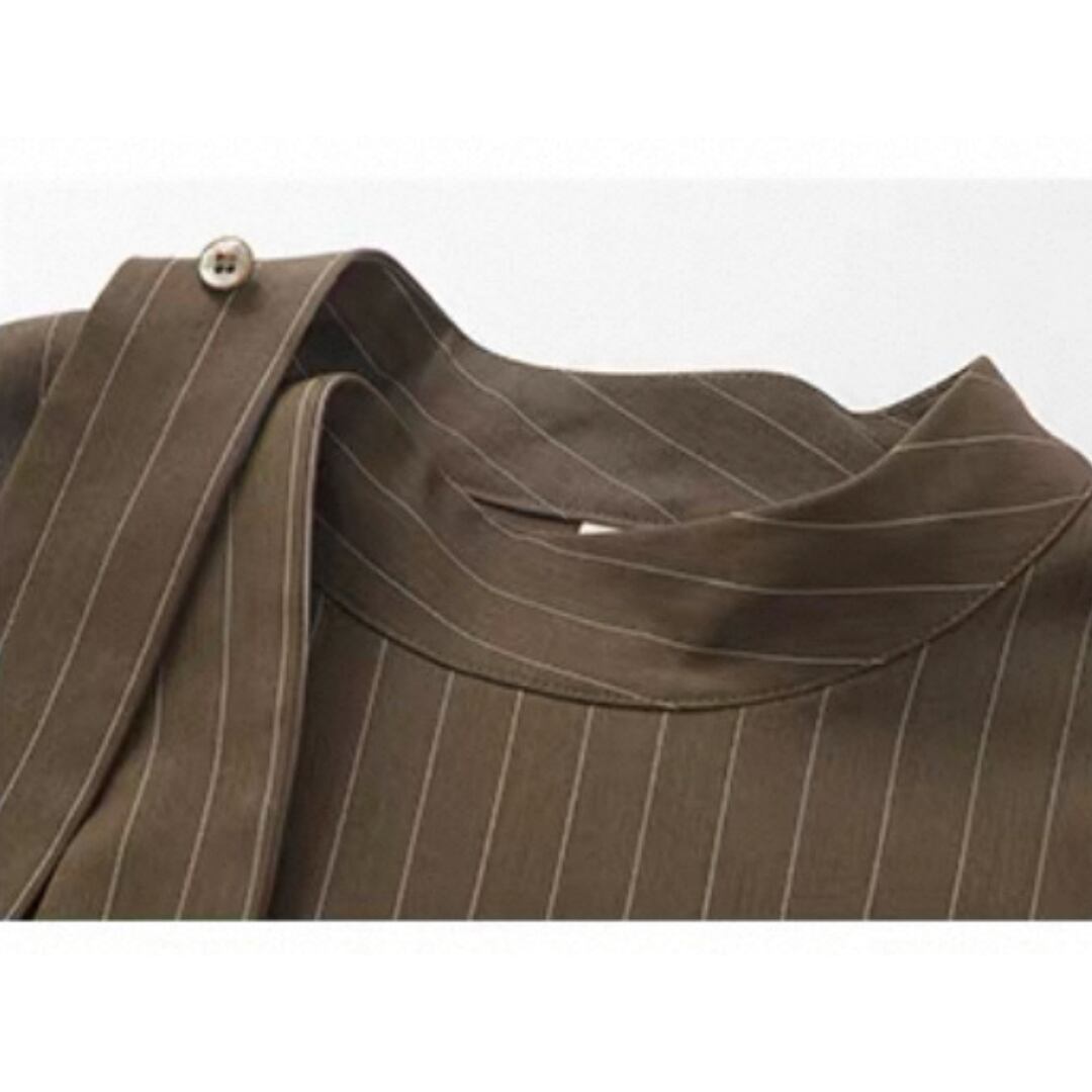 落ち感のあるストライプが描く、直線的で凛としたシルエット。生地は防シワ性に優れ、ハリがありながらも柔らかく自然なドレープを生む。襟のリボンは垂らしてモードに、サイドで結んで柔らかくニュアンスを添えて。一枚でも、ワイドパンツと重ねても、自在に楽しめる一枚。