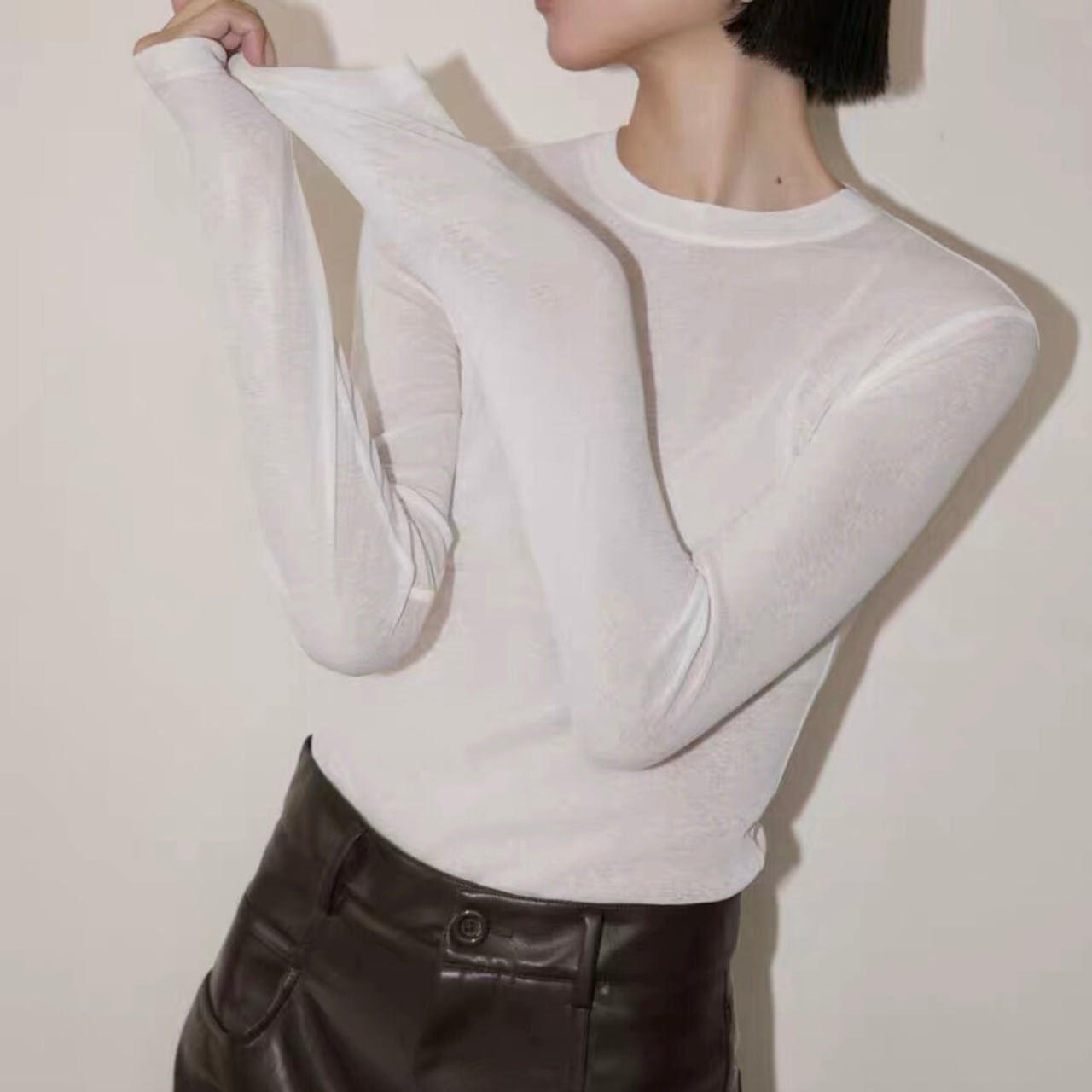 首にぴったりフィットしたネックライン、長めのスリーブ、全体的なスリムシルエット、全て計算されたディテールがボディラインを美しく魅せ、瞬時にモードな印象に。